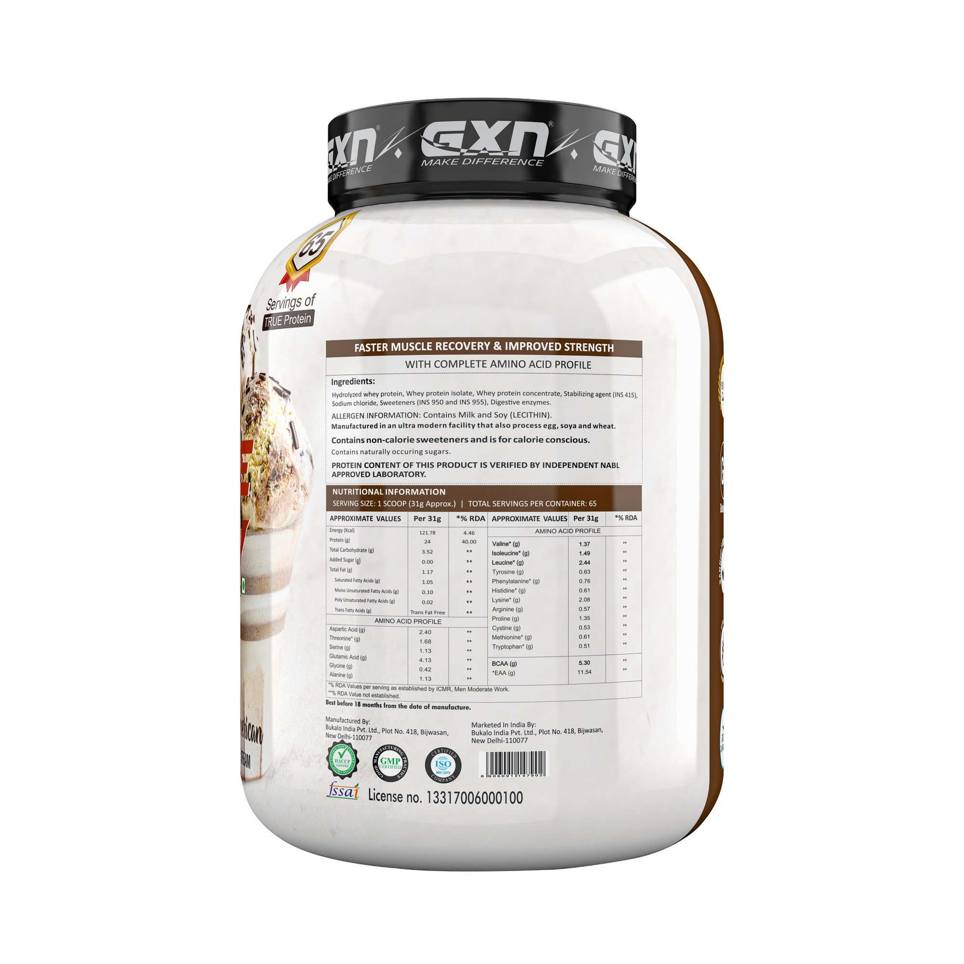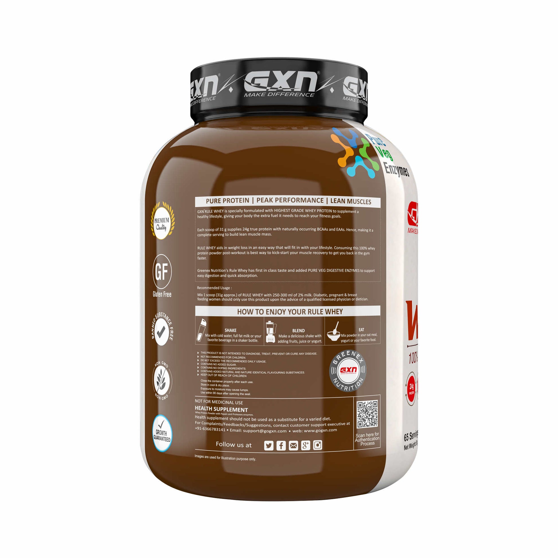 GXN Rule Whey is gluten & sugar-free with pure veg digestive enzymes to support easy digestive and quick absorption. This purest protein is a scientifically proven supplement that assists & promotes lean muscle body with peak athletic performance.The multi-functional supplement provides unbeatable strength during workouts and makes gym or sports time qualitative.