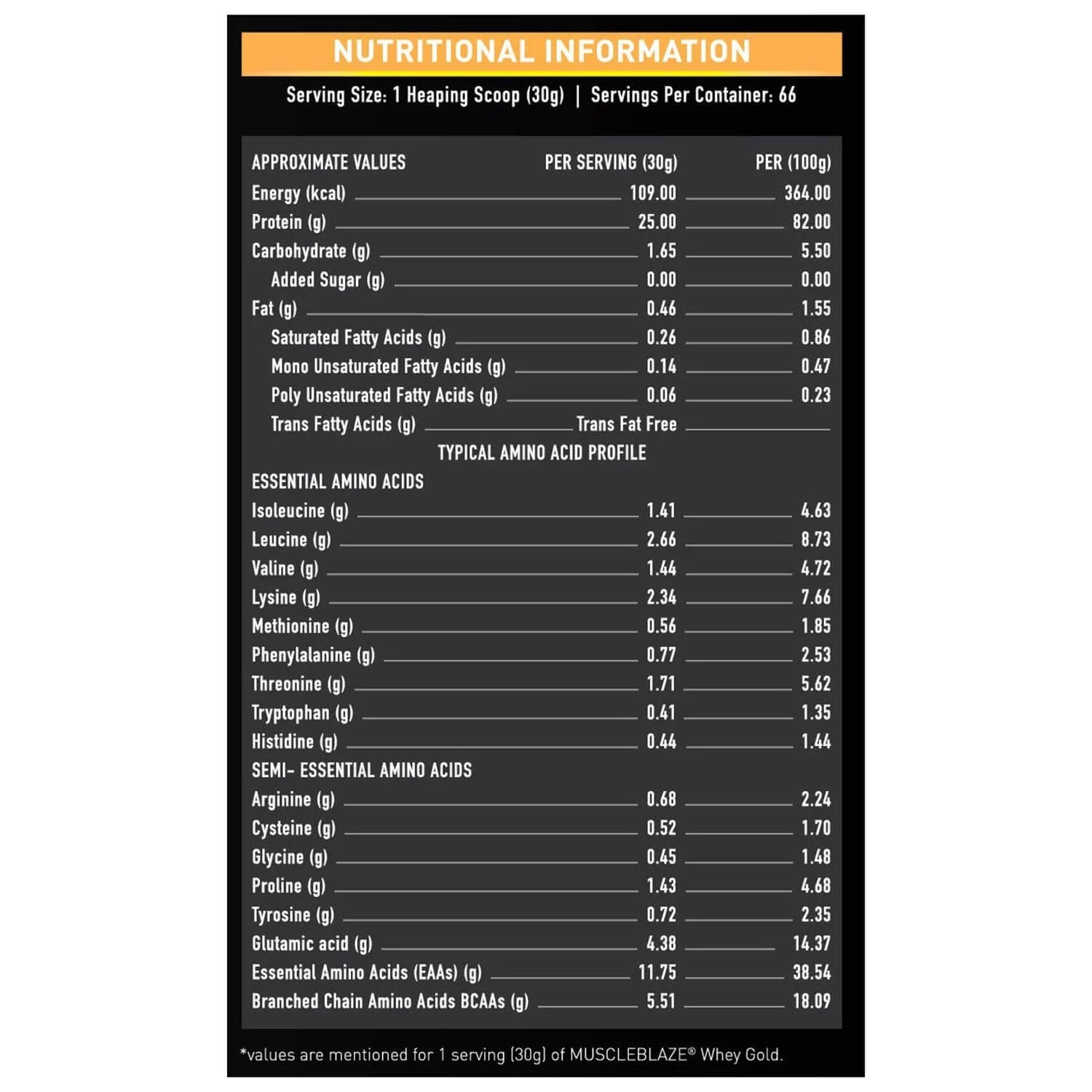 - 2 Enriched with 6.62g of BCAA(s) and 14.1g of EAA(s), MuscleBlaze® Whey Gold boosts anabolism in the body to achieve lean muscle gain